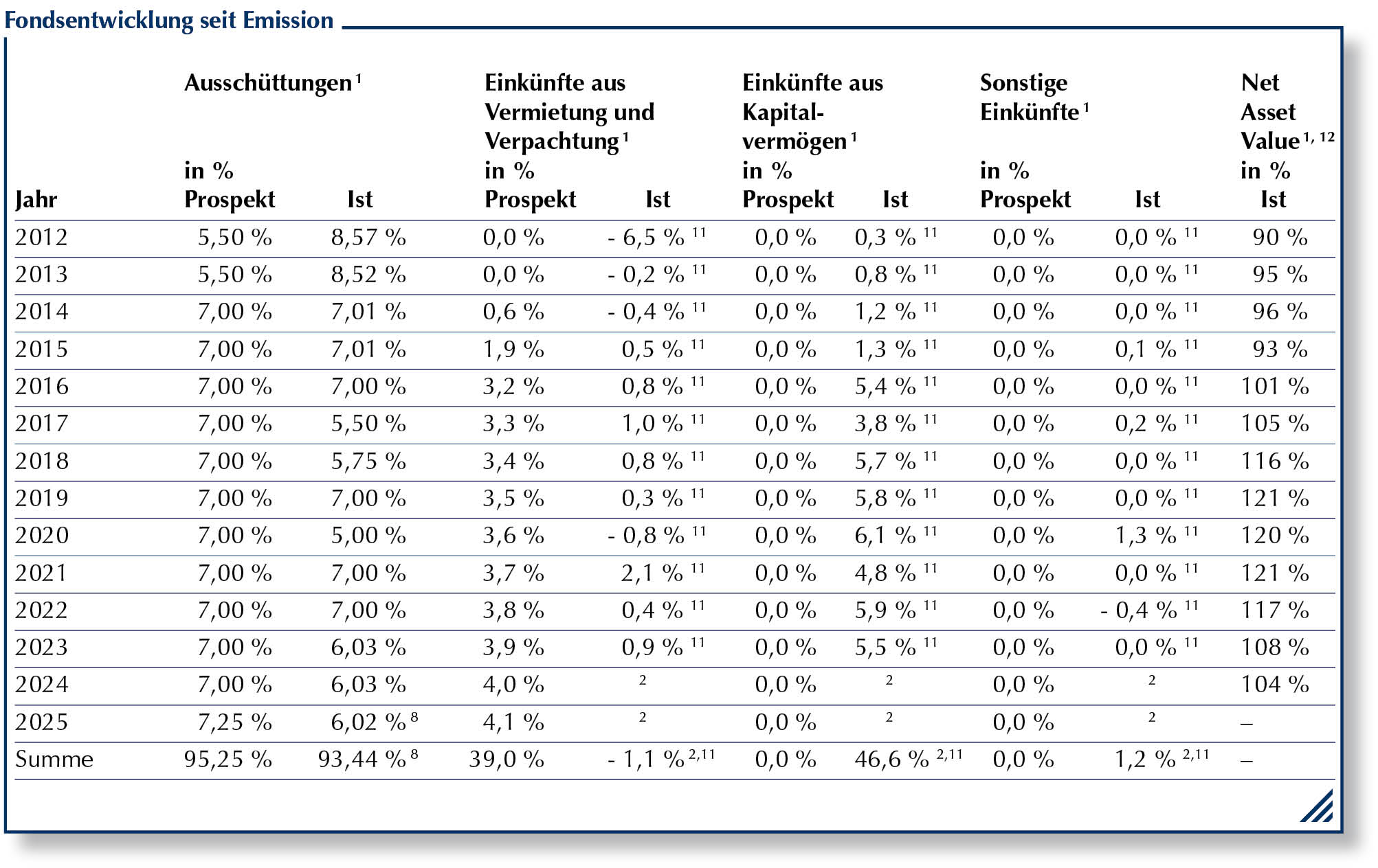 Die Fondsentwicklung stellt sich seit Emission wie folgt dar (aus Geschäftsbericht 2024):